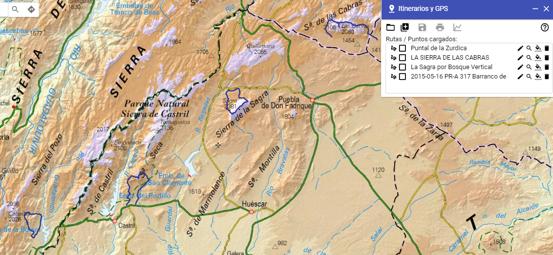 Ruta.- La ruta parte de la cota 1.120 y comienza subiendo 4,7 km (primeros 2km por sendero) con pte med +8%, hacia el N, por el Barranco del Caballo hasta alcanzar la Morra del Aserrador (1.488m). Tras una bajada -0,5km- sube (3,3km, pte med +11%) por el Gollizno del Calar (hasta +39% pendiente), –desde donde toma a NE y luego a E-, hasta el Puntal del Risco o La Zurdica (1.833m). Desde la cima, el resto de la ruta es en bajada (8,2km-2,6 por camino-, pte med -9%) a NE primero hacia El Cinto y luego a S por el Barranco del Carrascalillo y el camino de Castril a S.Clemente, pasando por la aldea de Corralón, hasta el km 30,7 de la A-326, punto final de la ruta.